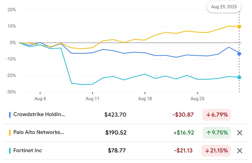 شهدت أسهم عمالقة الأمن السيبراني فورتينت (FTNT) وكراودسترايك (CRWD) وبالو ألتو نتووركس (PANW) تراجعات حادة عقب إعلانات أرباحها الأخيرة، رغم أن النتائج المالية نفسها بدت قوية.