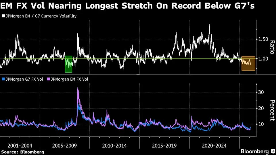 في مفارقة لافتة، أصبحت عملات الأسواق الناشئة أقل تقلبًا من نظيراتها في الاقتصادات المتقدمة، في أطول فترة استقرار نسبي منذ أكثر من عقدين.