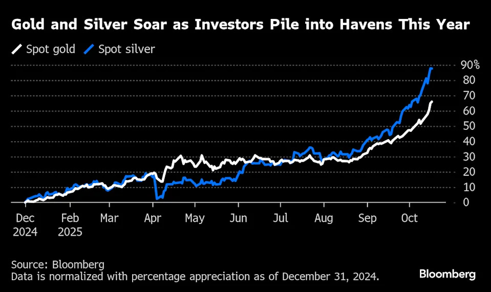 يرى محللو Bloomberg أن ارتفاع الذهب بأكثر من 60% منذ بداية العام يعكس طلبًا قياسيًا من البنوك المركزية وتدفقات ضخمة إلى صناديق المؤشرات المتداولة، إلى جانب المراهنات المتزايدة على خفض الفائدة الأمريكية.