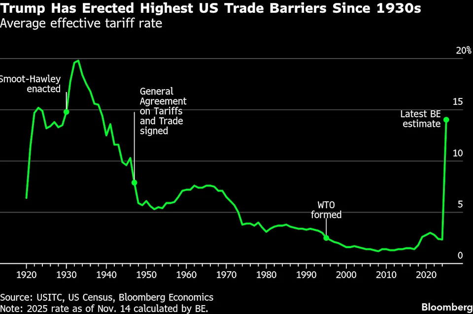 • الرسوم في 2025 ارتفعت إلى أعلى مستوياتها منذ ما يقارب قرن، وفق وصف التقرير، وهذه قفزة سياسية واقتصادية ضخمة.