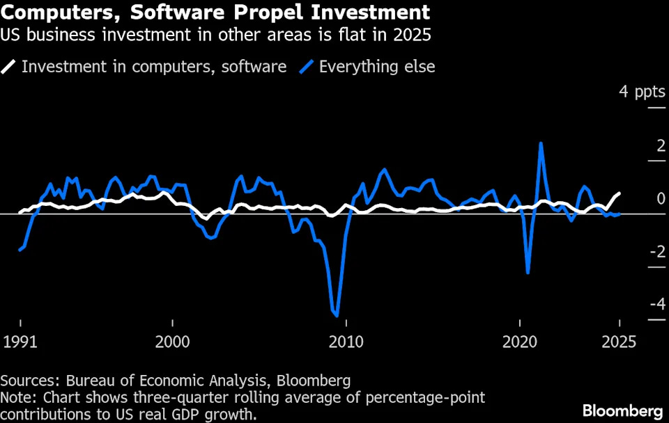 • لكن هذا النمو جاء تقريبًا من إنفاق أعلى على معدات الكمبيوتر والبرمجيات، أي استثمار مرتبط بالرقمنة والذكاء الاصطناعي.