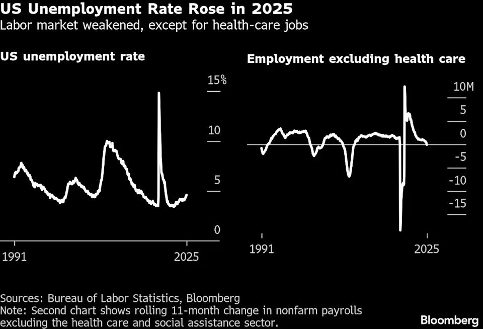 • خارج هذا القطاع، التوظيف كان ضعيفًا إلى حد أن التوظيف الإجمالي خارج الرعاية الصحية اتجه للتراجع خلال 2025.