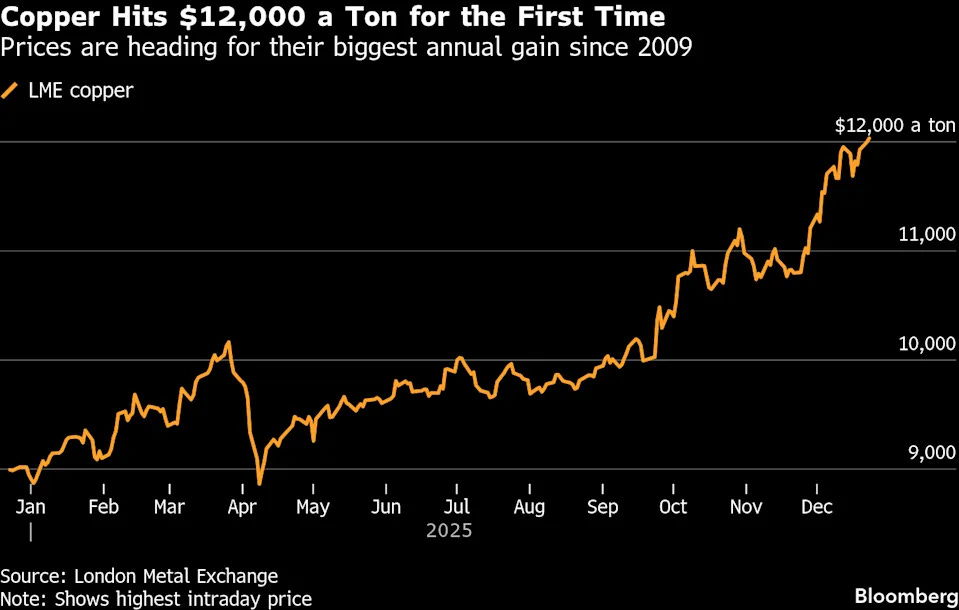 🔩 3) النحاس (Copper – HG=F) يخترق حاجز 12000 دولار
