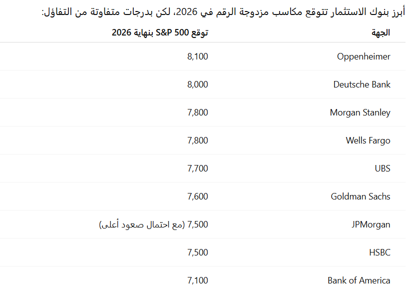 أبرز بنوك الاستثمار تتوقع مكاسب مزدوجة الرقم في 2026، لكن بدرجات متفاوتة من التفاؤل: