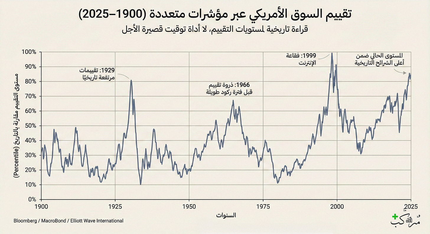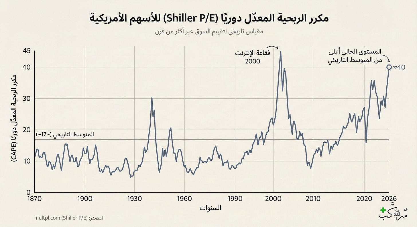 في ديسمبر 2025، تقارير متعددة أشارت أن CAPE (Shiller P/E) قرب 39–40 — مستويات تاريخيًا ارتبطت بعوائد ضعيفة لاحقًا، وأحيانًا بتصحيحات قاسية.