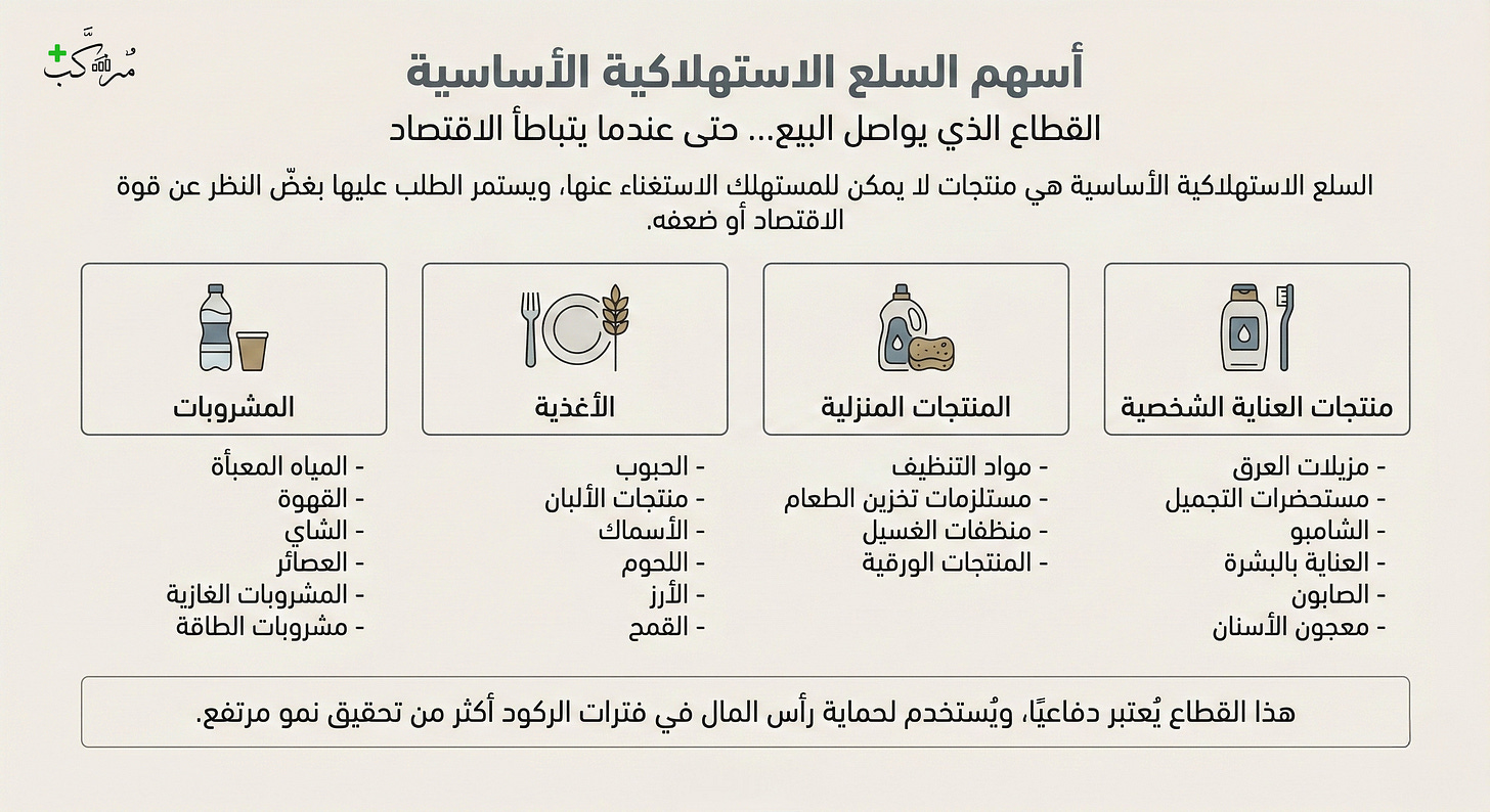 وفي المقابل، السلع الاستهلاكية الأساسية كانت متأخرة بشكل واضح مقارنة بالمؤشر.