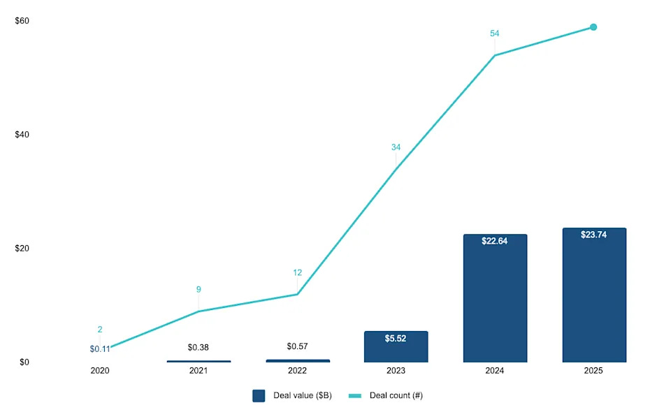 ضخت نفيديا (Nvidia – NVDA) مبلغ 23.7B$ في شركات الذكاء الاصطناعي من خلال 59 صفقة خلال 2025 وحدها، متجاوزة عدد وقيمة صفقاتها في 2024 التي بلغت 54 صفقة بقيمة 22.8B$.