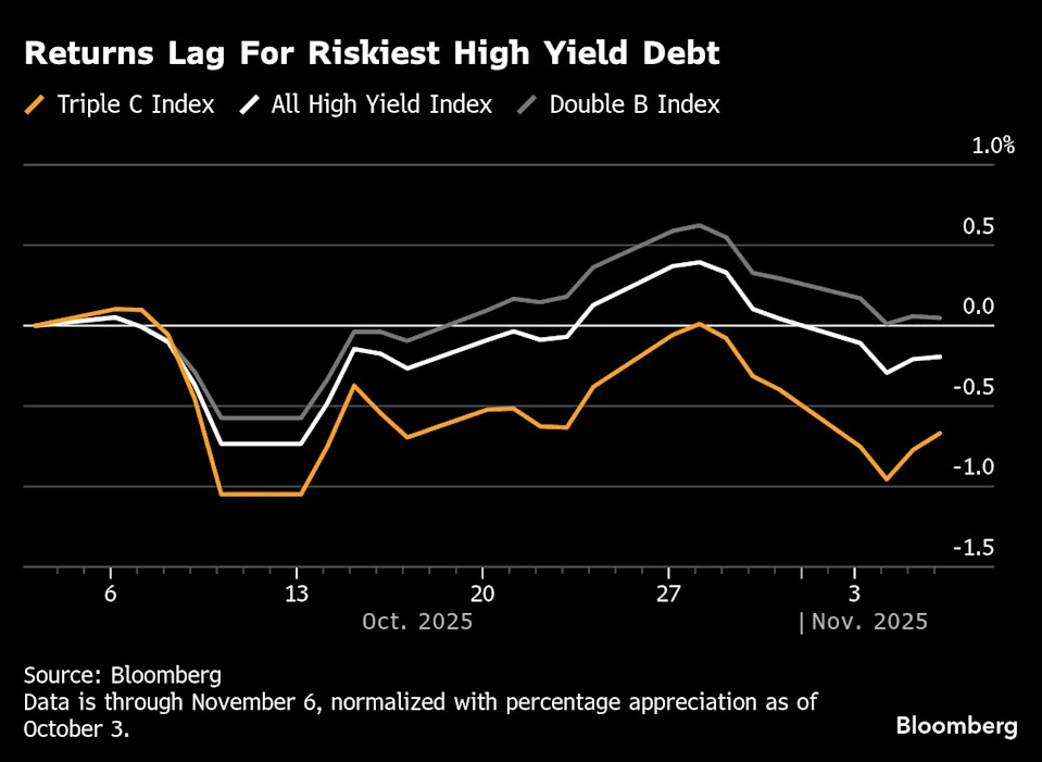 مؤشر السندات الأمريكية ذات التصنيف CCC تراجع 0.8٪ خلال الشهر المنتهي بنهاية أكتوبر، وهو أداء أضعف من السوق الكلي للسندات عالية العائد.