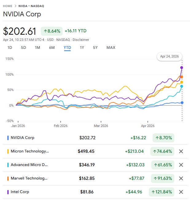 تُظهر بيانات الأداء حتى أبريل 2026 أن “الزخم” انتقل من القائد التقليدي إلى أطراف أخرى في سلسلة التوريد. وبينما كانت إنفيديا المحرك الوحيد للسوق في الماضي، نرى الآن توزيعاً للأدوار: