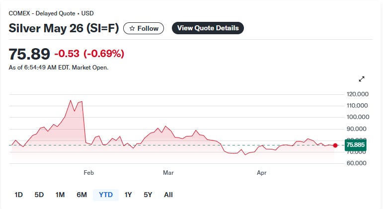 • الفضة (Silver – SI=F) عند 75.50$