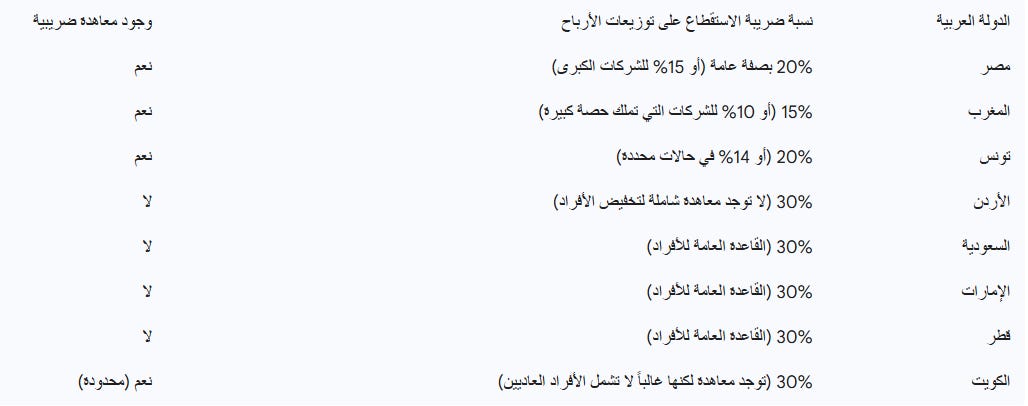 في مصر والأردن والمغرب: توجد ضرائب دخل محلية، وهنا يأتي دور المعاهدات التي تسمح للمستثمر بخصم ما دفعه في أمريكا من مستحقاته الضريبية المحلية (Tax Credit)، لضمان عدم دفع الضريبة مرتين على نفس الدرهم أو الجنيه.