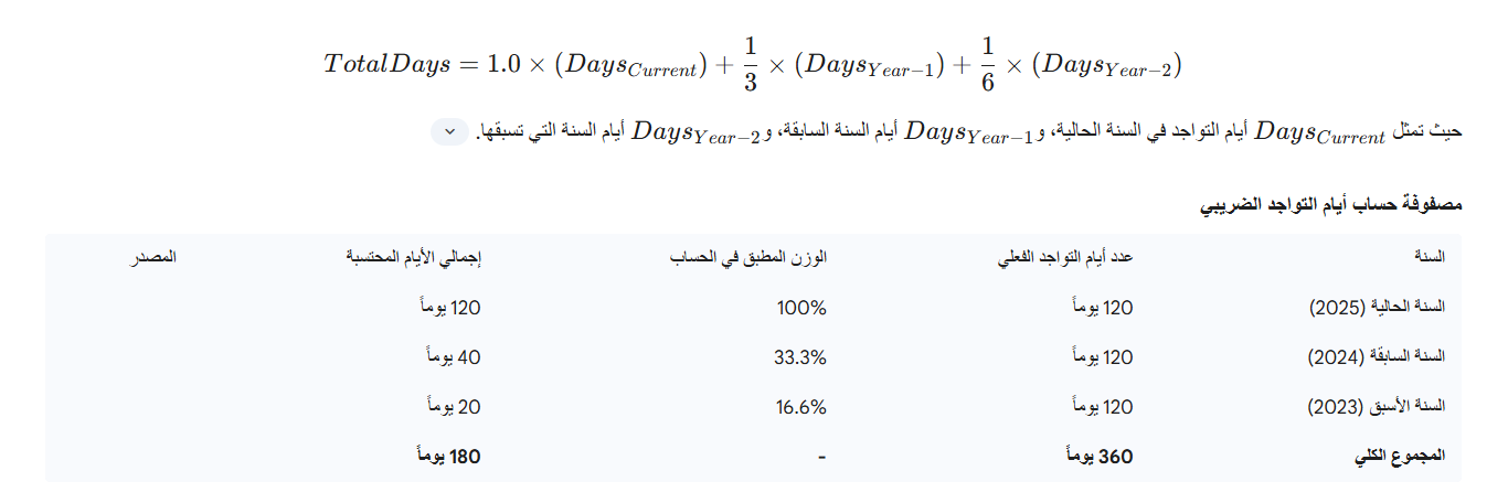 يتم حساب الأيام باستخدام الصيغة الرياضية التالية لضمان الدقة في التصنيف الضريبي: