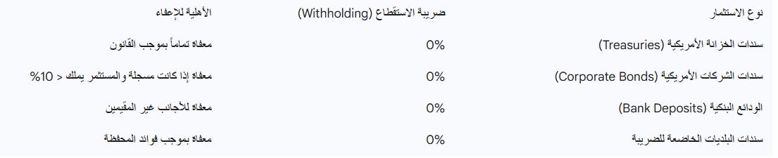 تقدم السندات الأمريكية (أدوات الدين) فرصة ذهبية للمستثمر العربي الراغب في دخل ثابت ومعفى من الضرائب. بموجب “استثناء فوائد المحفظة” (Portfolio Interest Exception) الذي أُقر في عام 1984، تُعفى الفوائد المدفوعة للأجانب من ضريبة الـ 30% التقليدية لتشجيع تدفق رؤوس الأموال الدولية.