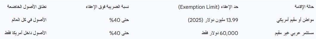 يُعتبر هذا الجزء من التقرير هو الأكثر حيوية لأصحاب الثروات، حيث تمثل ضريبة التركات الفخ الذي قد يلتهم 40% من استثمارات الشخص عند وفاته. المشكلة الكبرى تكمن في “فجوة الإعفاء”؛ فبينما يتمتع المقيم الأمريكي بإعفاء يصل إلى 13.99 مليون دولار (عام 2025)، لا يحصل المستثمر العربي غير المقيم إلا على إعفاء هزيل قدره 60,000 دولار فقط.