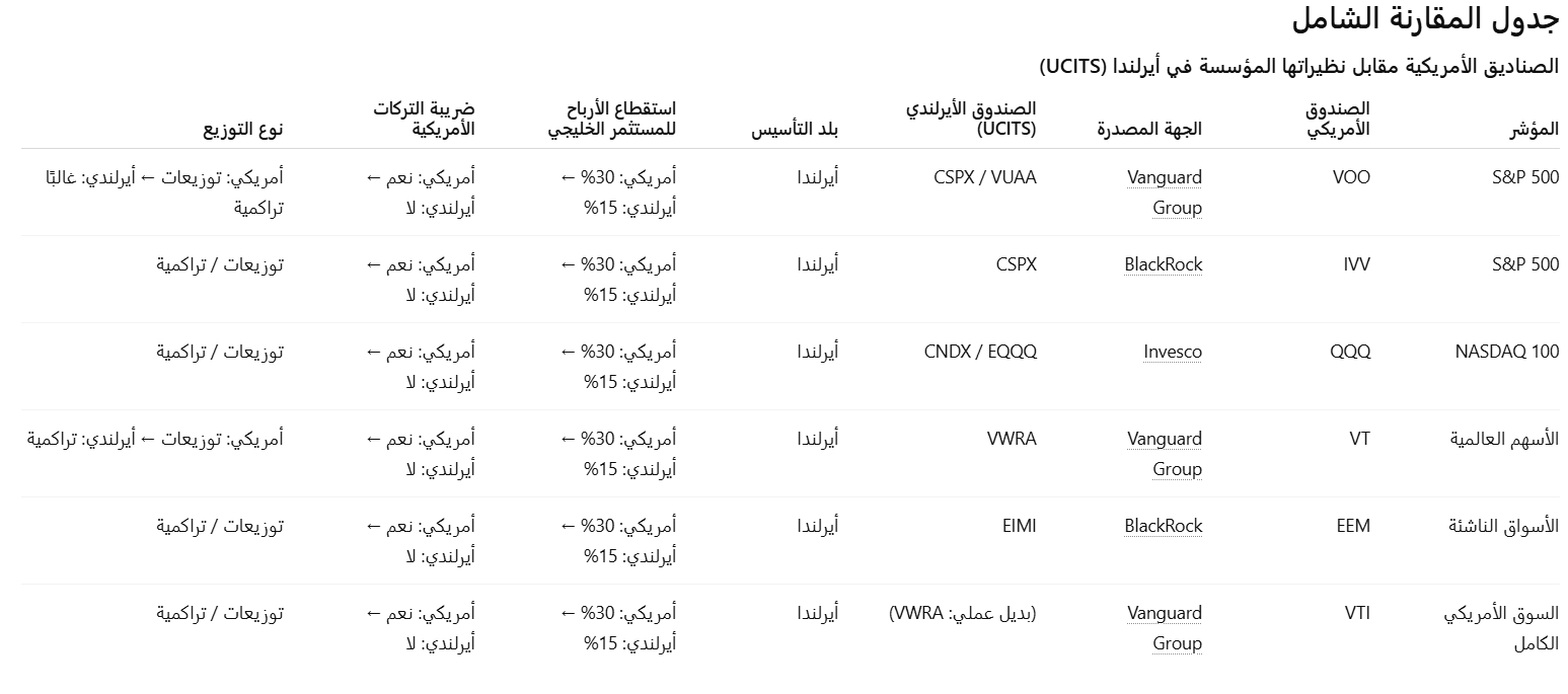 تعتبر أيرلندا “الملاذ المفضل” للمستثمرين الدوليين في السوق الأمريكي بسبب معاهدتها الفريدة مع الولايات المتحدة. بالنسبة للمستثمر العربي في دول الخليج (حيث الاستقطاع 30%)، فإن شراء صندوق استثمار متداول (ETF) يتتبع مؤشر S&P 500 ولكنه مؤسس في أيرلندا يوفر مزيتين ضخمتين: