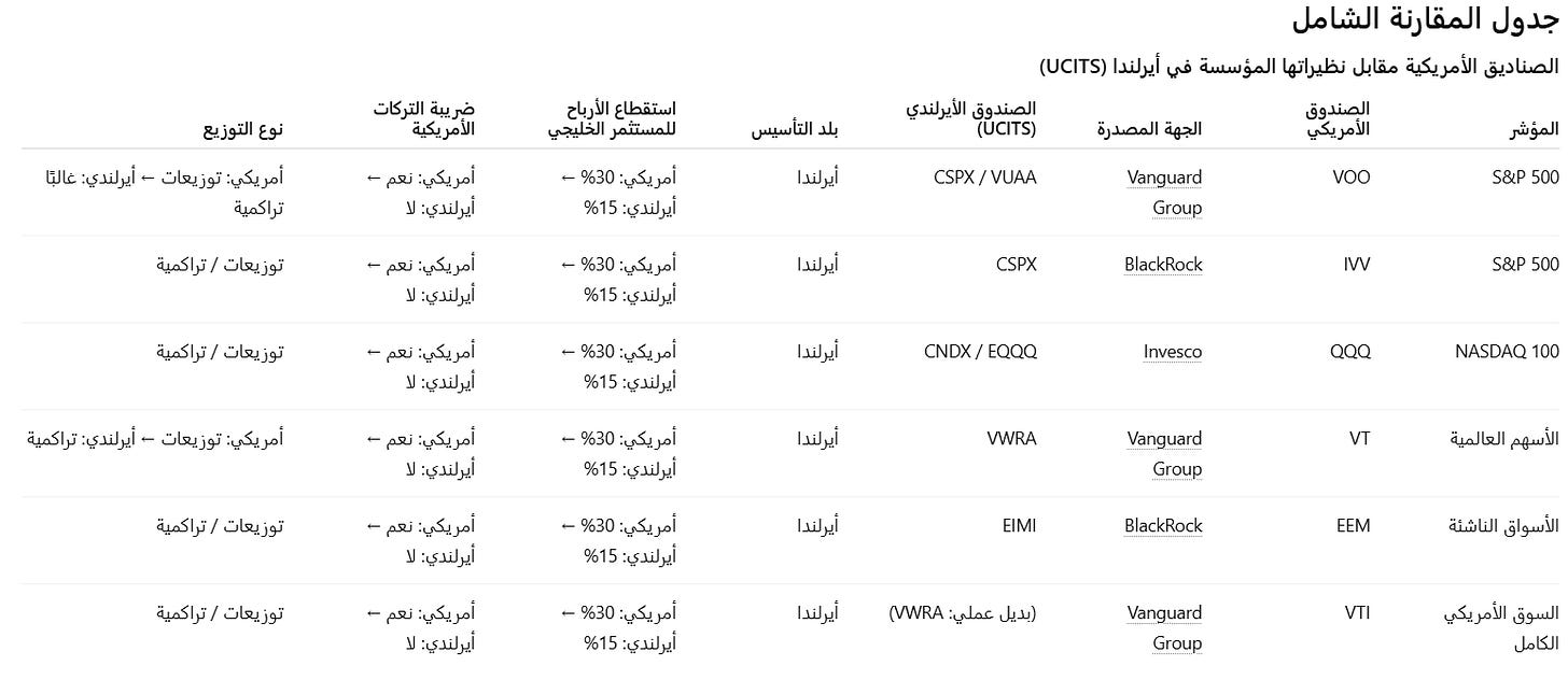 تجاوز ضريبة التركات: بما أن الصندوق مؤسس في أيرلندا، فإنه يُعتبر “أصلاً غير أمريكي”. إذا توفي المستثمر العربي، لا تملك مصلحة الضرائب الأمريكية أي حق في المطالبة بضريبة الـ 40% على هذه الأصول.