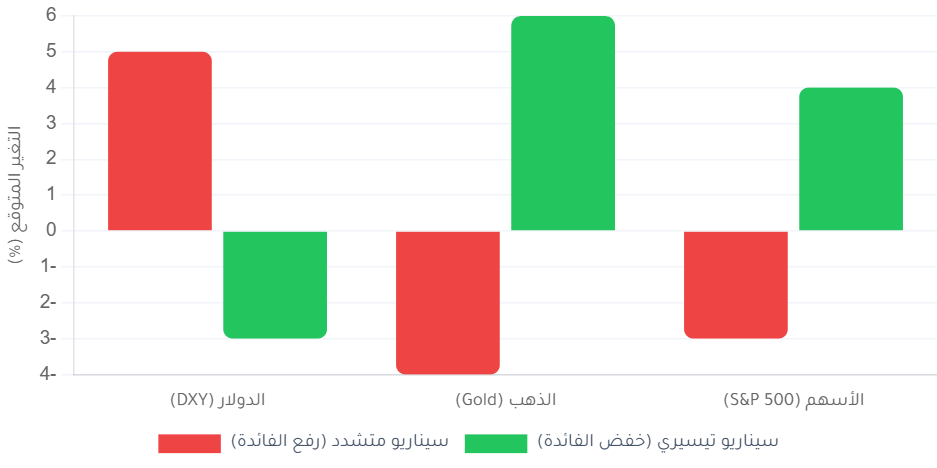 يوضح الرسم البياني التالي كيف تستجيب الأصول الرئيسية (الدولار، الذهب، الأسهم) لسيناريوهات السياسة النقدية المختلفة التي قد يتبناها المحافظ الجديد. لاحظ العلاقة العكسية بين الدولار والذهب.