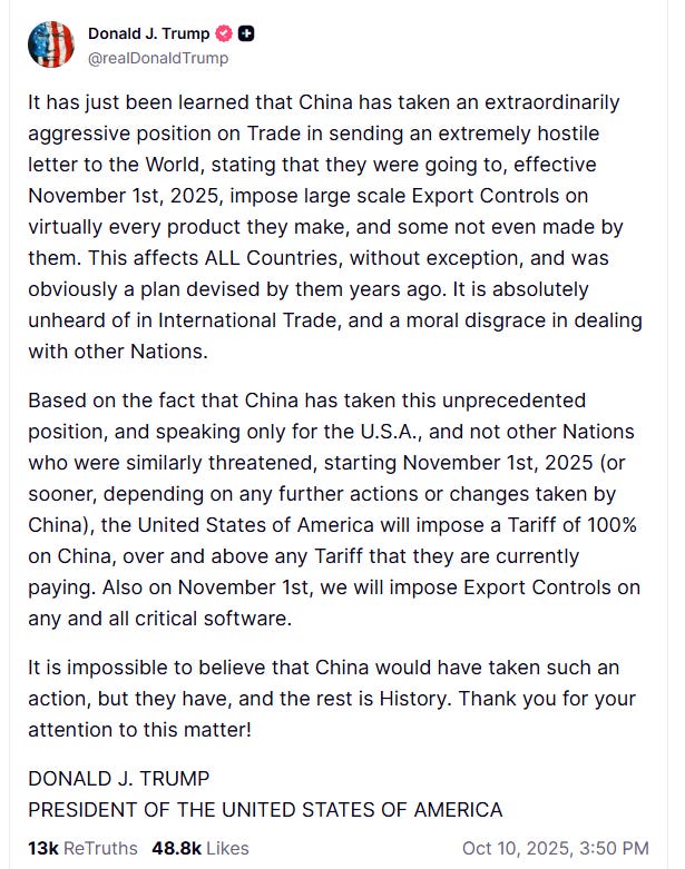 الرئيس الأمريكي أعلن عن رسوم جمركية جديدة تصل إلى 100٪ على الواردات الصينية، بعد خطوة من بكين بتقييد صادرات المعادن النادرة — وهي مواد تدخل في صناعة الرقائق والإلكترونيات والأسلحة.