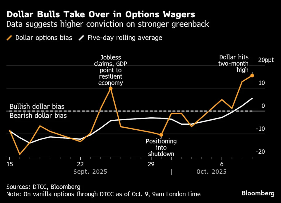 يبين الرسم أن انحياز خيارات الدولار (باللون البرتقالي) تحوّل بقوة إلى الاتجاه الصعودي خلال الأسبوع الأول من أكتوبر 2025، متجاوزًا منطقة “الحياد” إلى أعلى مستوى في شهرين.