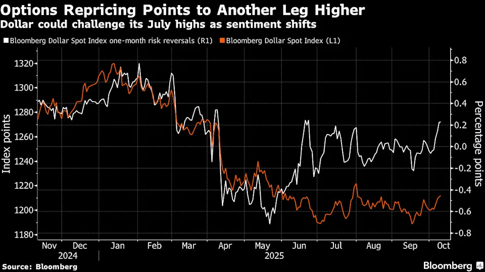 تُظهر البيانات أن مؤشر بلومبرغ للدولار الفوري (الخط الأبيض) ارتفع تدريجيًا منذ أغسطس، في حين تحسّنت ميول المتداولين في سوق الخيارات (الخط البرتقالي) نحو مراكز الشراء.