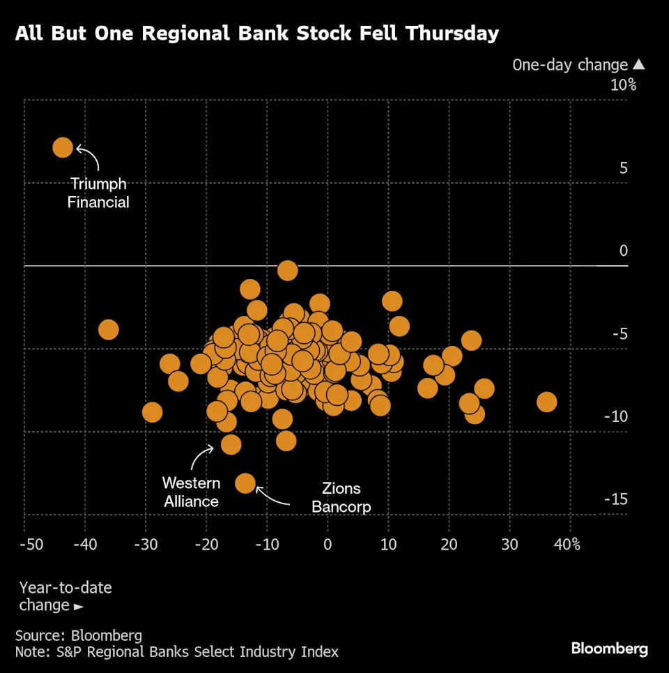 انخفضت أسهم بنك أوف أمريكا (Bank of America)، سيتي جروب (Citigroup)، مورغان ستانلي (Morgan Stanley) وويلز فارجو (Wells Fargo) بأكثر من 1.5% في تداولات ما قبل السوق في نيويورك، بعد أن سجل مؤشر البنوك الإقليمية S&P Regional Banks Select Industry Index هبوطًا بنسبة 6.3% يوم الخميس، أكبر خسارة منذ أزمة عام 2023.