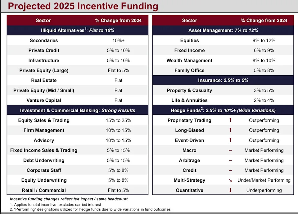 تُقدّر جونسون أسوشيتس أن مكافآت نهاية عام 2025 سترتفع عبر معظم قطاعات التمويل، مع زيادة قد تصل إلى 25% للمتداولين في الأسهم، وارتفاعات بين 5% و15% في أسواق السندات والائتمان.