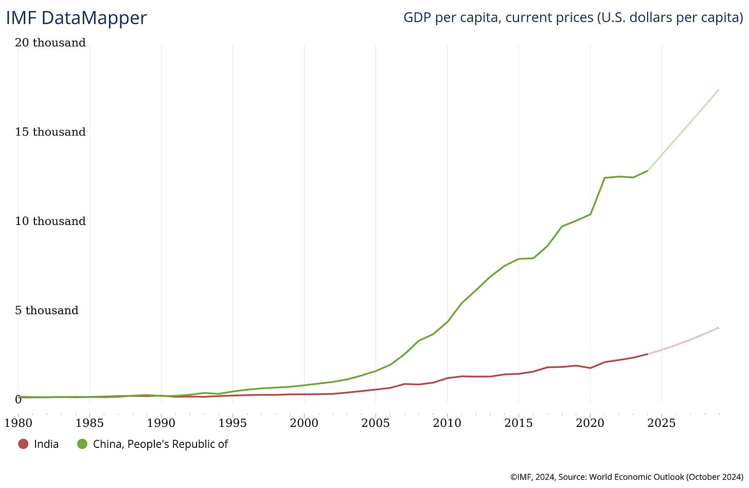 في ثمانينيات القرن الماضي، بدأت اقتصادات الصين والهند بحجم متقارب نسبيًا. ومع ذلك، تمكنت الصين من تحقيق تقدم كبير جعل اقتصادها أكبر بخمس مرات من اقتصاد الهند. ولكن مع تباطؤ الاقتصاد الصيني وسعي الشركات الغربية لنقل مصانعها إلى أماكن أخرى، يطرح السؤال: هل يمكن أن يكون دور الهند الآن لتحقيق معجزة النمو الخاصة بها؟