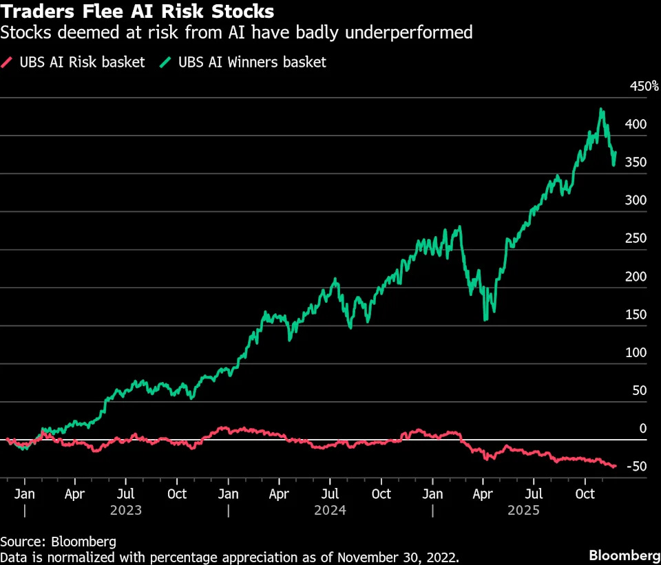سلة UBS للشركات المعرضة للخطر بسبب الذكاء الاصطناعي انهارت أكثر من -35%، بينما تضاعف Nasdaq 100.