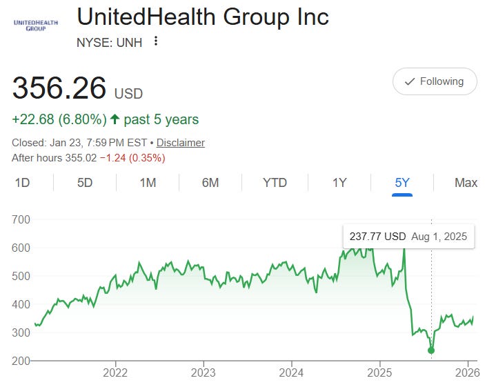 رغم قوة نموذج العمل، تعرّض سهم UnitedHealth لهبوط حاد في 2023 بسبب مخاوف تنظيمية وضغوط على قطاع التأمين الحكومي (Medicare Advantage).